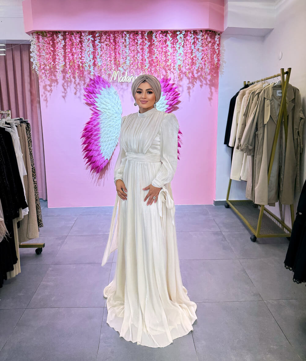 Düğünler, nişanlar ve özel davetler için ideal olan bu abiye, şık aksesuarlar ve topuklu ayakkabılarla kombinlendiğinde sofistike bir görünüm oluşturur. Zarif detayları ve kaliteli kumaşı sayesinde sade bir makyaj ile bile dikkat çekici bir stil yakalayabilirsiniz.