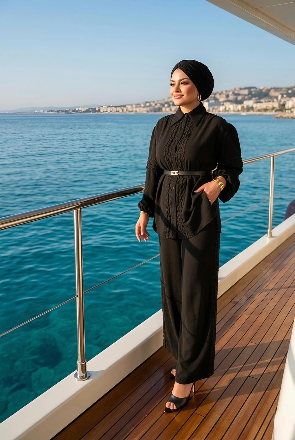 Zarafetin detaylarda gizli olduğuna inanıyoruz; bu yüzden ankara etlik kadın giyim modasını yakından takip edenlere özel, dantelin sofistike etkisini bu takımda topladık. Blanqa Siyah Suit giydiğinizde, hem pantolonun esnek yapısı hem de üst tuniğin dökümlü duruşu sayesinde kendinizi oldukça rahat hissedeceksiniz. Ankara etlik tesettür giyim dünyasının en sevilen modellerinden biri olan bu suit, özellikle dikey hatlı kesimiyle daha ince ve uzun bir görünüm sergilemenize yardımcı olur. Ankara butik kadın giyim standartlarını belirleyen tasarım detaylarımız, her ortamda bakışları üzerinize çekmenizi sağlar.