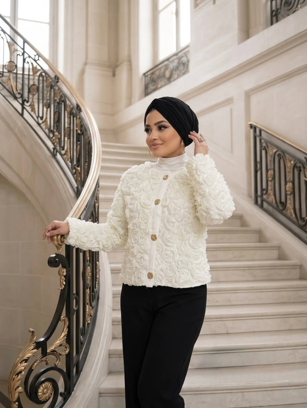 Güllü Beyaz Ceket modelini nasıl kombinleyeceğiniz tamamen sizin hayal gücünüze kalmış. Ankara butik kadın giyim trendlerine göz attığımızda, bu ceketin genellikle geniş paça pantolonlar veya kalem eteklerle tercih edildiğini görüyoruz. Şık bir ankara tesettür butik parçası olan bu ürün, üzerine eklenen gül detayı sayesinde kolye veya broş kullanımına gerek bırakmadan stilinizi tamamlıyor. Güllü Beyaz Ceket hem günlük kot pantolonlarla hem de ipek kumaşlarla muazzam bir kontrast oluşturur. Kadın giyim butik ankara moda anlayışını yansıtan bu yaklaşım, sizi her zaman bir adım öne çıkarır.