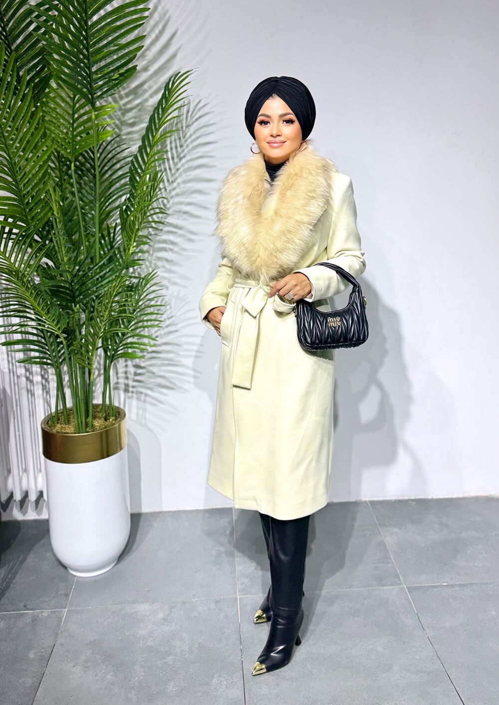 Krem Kürklü Kaşe Kaban Sofistike krem rengi ve zarif kürk detaylarıyla öne çıkan kaşe kaban, modern kesimi ve yumuşak kumaşıyla sıcak tutar ve konfor sağlar. Hem günlük kullanımda hem de özel anlarda tarzınızı ön plana çıkarır. Her kombine uyum sağlayacak şekilde tasarlanmıştır.