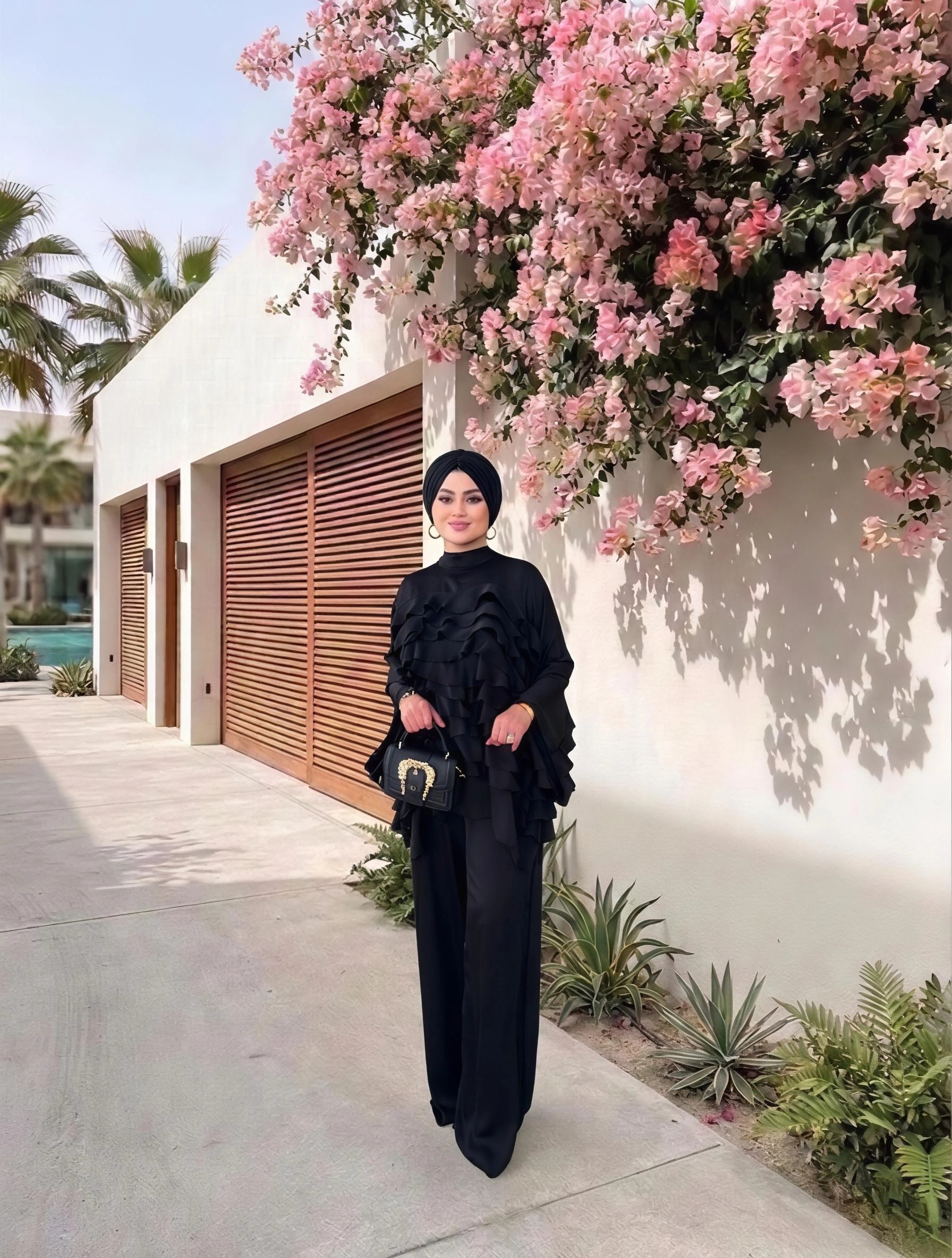 Siyah Tasarım Takım üst kısmında yer alan fırfır detayları, ürüne romantik ve modern bir hava katmaktadır. Estetik görünümünün yanı sıra fonksiyonelliği ile de ön plana çıkan bu model, tesettür giyim mağazası arayan hanımların beklentilerini tam anlamıyla karşılamaktadır. Üst boyunun 75 cm olması, tesettür ölçülerine uygun bir kullanım imkanı sağlarken, 60×2 cm göğüs ölçüsü ise hareket özgürlüğünüzü kısıtlamaz.